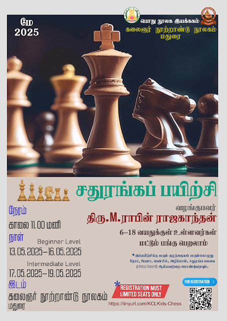 பொதுநூலக இயக்ககம், கலைஞர் நூற்றாண்டு நூலகம் -மதுரை,குழந்தைகள் பிரிவில் , குழந்தைகள் கோடைவிடுமுறையை பயனுள்ளமுறையில் கழிக்கும் வகையில் ”கோடைக்கொண்டாட்டம் -2025” என்ற நிகழ்வு நடைபெறவிருக்கின்றது .இதில் மே மாதம் முழுவதும் மாறுபட்ட தலைப்புகளில் துறைசார்ந்த வல்லுநர்களைக்கொண்டு தினசரி நிகழ்வுகளும் , திறன் மேம்பாட்டு பயிற்சிப்பட்டறைகளும் நடைபெறவிருக்கின்றன.அந்த வகையில் திரு.M. ராபின் ராஜகாந்தன், அவர்களின் "5. சதுரங்க பயிற்சி" என்ற பயிற்சிப்பட்டறை நடைபெறவுள்ளது. இப்பயிற்சிப் பட்டறையில் சதுரங்க அடிப்படை பயிற்சி (13.05.2025 முதல் 16.05.2025 வரையிலும்) மற்றும் இடைநிலை பயிற்சி (17.05.2025 முதல் 19.05.2025 வரையிலும் ) மற்றும் சதுரங்கத்தில் உள்ள நுணுக்கங்கள் மற்றும் முழுமையான பயிற்சியும் அளிக்கப்படும். முதலில் வருபவருக்கு முன்னுரிமை என்ற அடிப்படையில் இந்நிகழ்ச்சிக்கு அனுமதிக்கப்படுவர் ஆகவே முன்பதிவு அவசியம். இதில் பங்கு பெறும் சிறுவர்களுக்கு (31.05.2025) அன்று நடைபெறும் நிகழ்வில் பாராட்டு சான்றிதழ் வழங்கப்படும். ஆகவே விருப்பமுடைய குழந்தைகள் இந்த நிகழ்வைப் பயன்படுத்திக் கொள்ளுமாறு அன்போடு கேட்டுக் கொள்கிறோம். அனுமதி இலவசம்! நன்றி ...